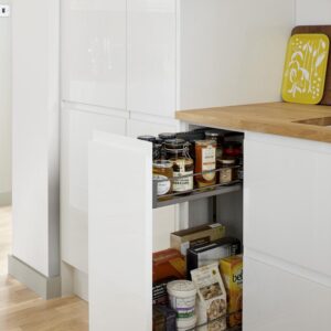 From up-and-over ‘garage door’ style unit fronts that require no out-swing space, to retractable shelving. The pull-out shelf is a really nifty idea, allowing for easy access to frequently used appliances, such as your beloved coffee machine or smoothie maker, without having to clear off worktop space for them.